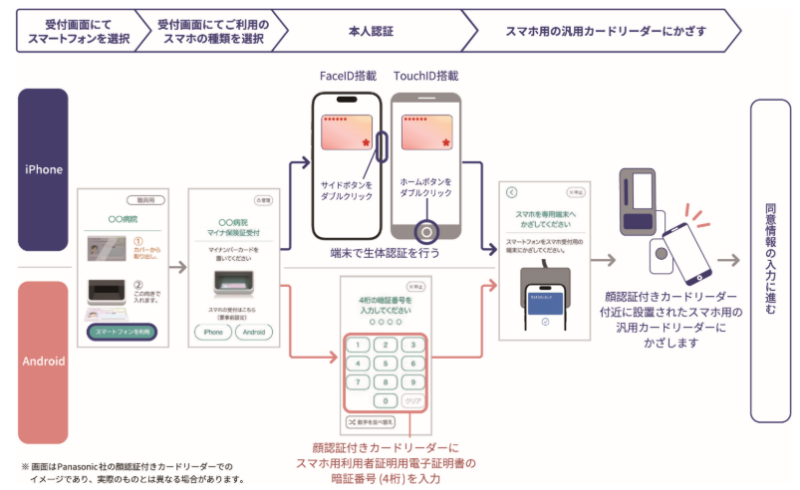 受付に設置された顔認証付きカードリーダーを操作し、本人認証を行った後、スマートフォンをスマホ用の汎用カードリーダーにかざして利用できます。かざした後は顔認証付きカードリーダーで同意情報を入力します。