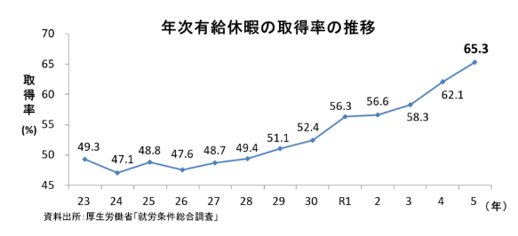 「過労死等の防止のための対策に関する大綱」(令和6年8月2日閣議決定)により、令和10年までに年休の取得率を70%とすることが、政府の目標に掲げられています。一方で、令和5年の年休の取得率は65.3%と過去最高となったものの、目標には届いていない状況です。(図1)