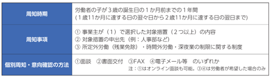 3歳未満の子を養育する労働者に対して、子が3歳になるまでの適切な時期に、事業主は柔軟な働き方を実現するための措置として1-Aで選択した制度(対象措置)に関する以下の事項の周知と制度利用の意向の確認を、個別に行わなければなりません。
