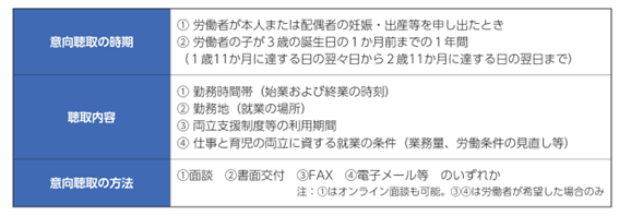 事業主は、労働者が本人または配偶者の妊娠・出産等を申し出た時と、労働者の子が3歳になるまでの適切な 時期に、子や各家庭の事情に応じた仕事と育児の両立に関する以下の事項について、労働者の意向を個別に 聴取しなければなりません。