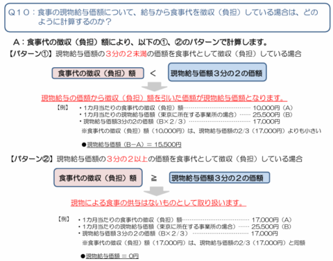 実際の計算方法を見てみましょう。今回改正のあった食事を例にしてみると、食事を現物支給し給与から食事代を徴収する際に、徴収額が現物給与価額の3分の2未満となる場合(下図【パターン①】)、3分の2以上となる場合(下図【パターン②】)で取り扱いが変わります。給与から食事代を徴収している企業では、価額改定後の徴収額の見直しや、現物給与に該当するかどうかのチェックも必要になるでしょう。